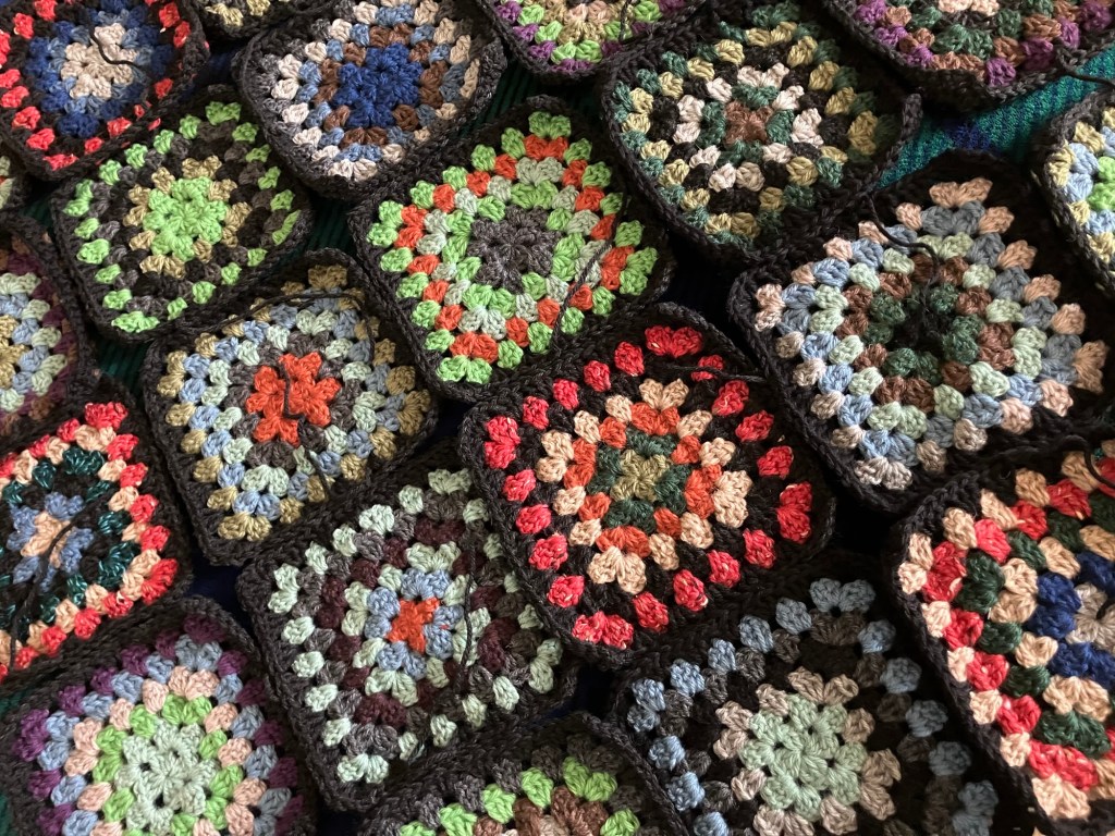 I’ve been working on crocheting black border around each granny square. I knew it was going to take a lot of black yarn, and it is! I may have to scrounge around at stores and see if I can find some more. Perhaps at Michael’s, because Hobby Lobby has all but stopped carrying wool. I sure miss Joann’s!